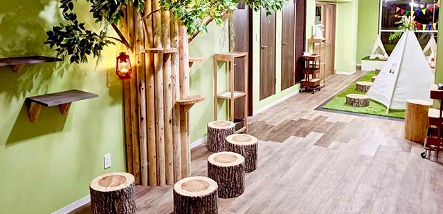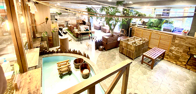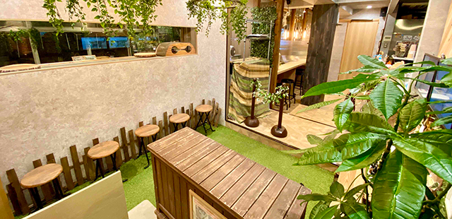 アニミルの店内は受付兼カフェスペースの「ベースキャンプ」と、動物たちが暮らす「アドベンチャーエリア」「パークエリア」「ガーデンエリア」という4つのエリアに分かれております。「アドベンチャーエリア」では昼はピクニック、夜はキャンプをイメージし、時間によってふれあえる動物が変わります。「パークエリア」では小型犬と猫、そしてマイクロブタを中心とした公園をイメージしたエリア。「ガーデンエリア」は大型犬エリアとなりビッグなモフモフを感じて優しい気持ちになれます。のびのび自由に暮らす動物たちと憩いの時間をお過ごしください。
